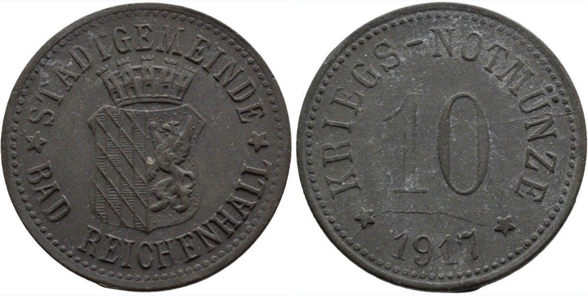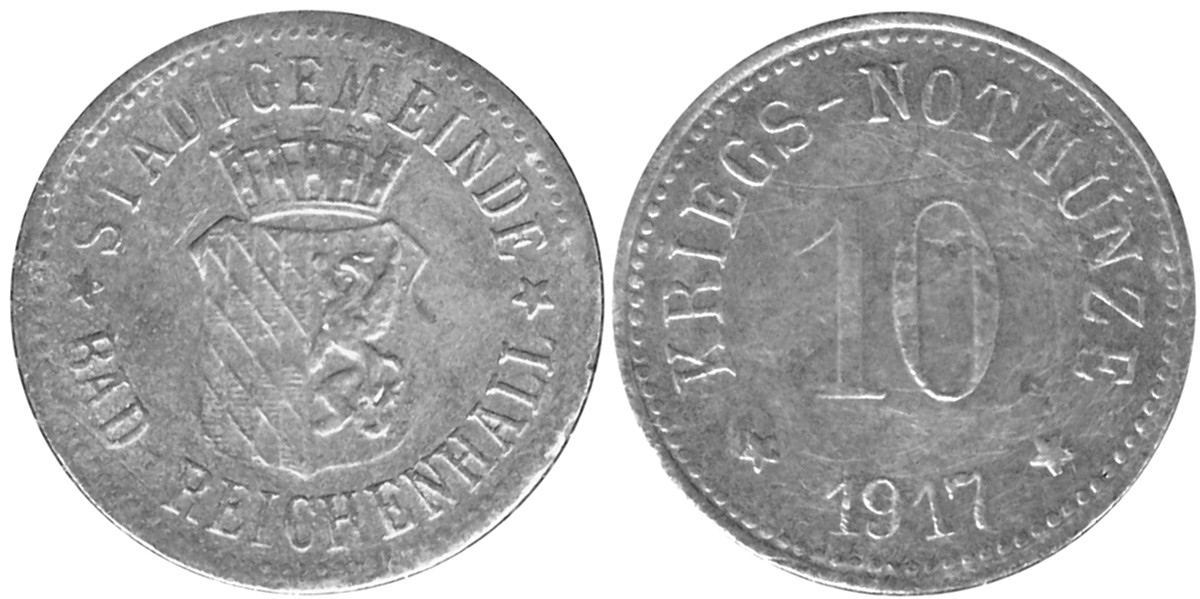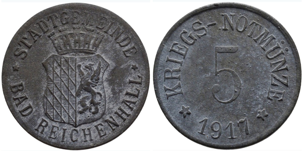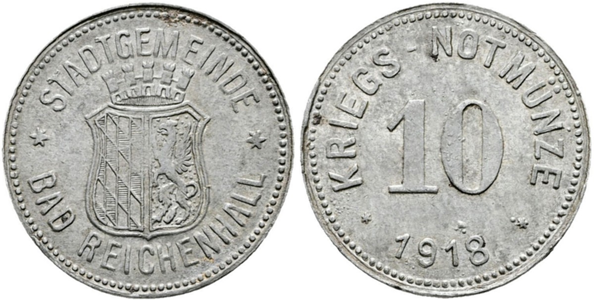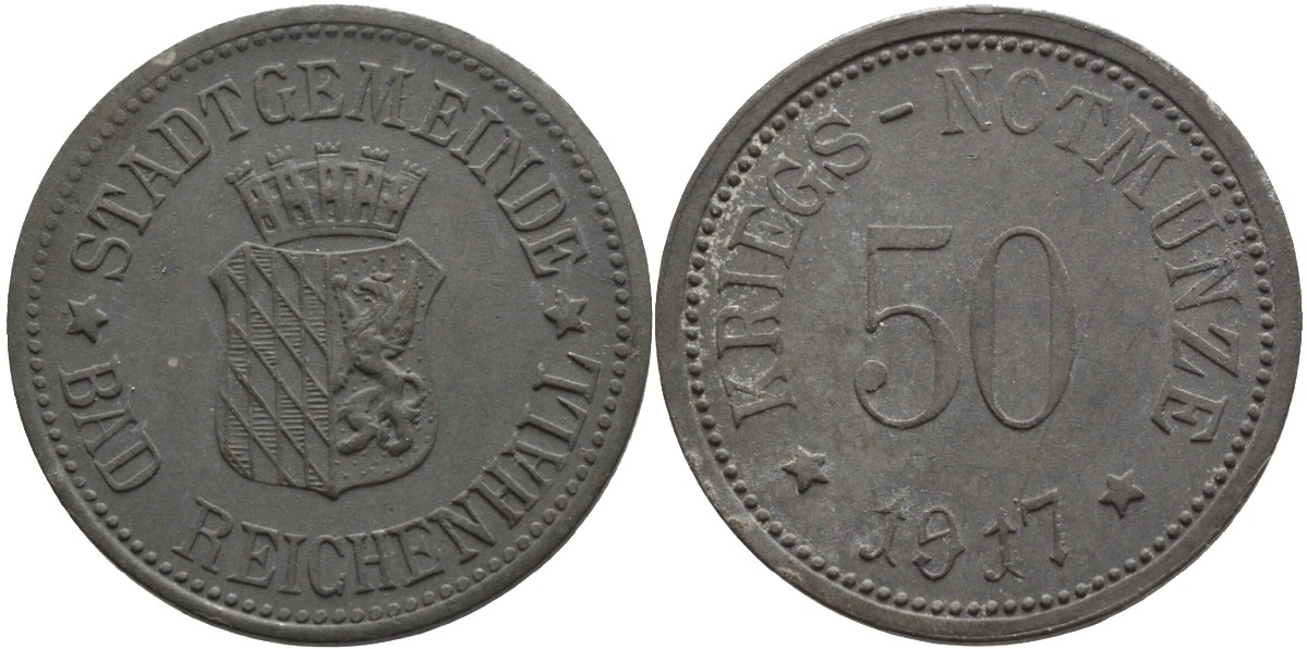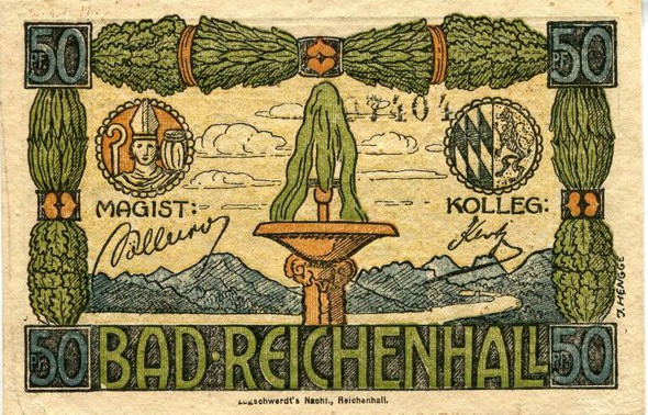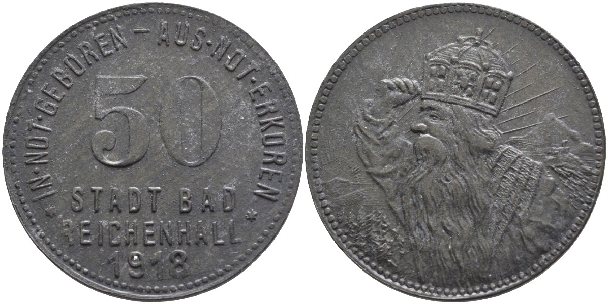 Na rewersie legendarna postać cesarza Karola (Wielkiego), który zamieszkuje wnętrze góry w Reichenhall. Raz na sto lat można spotkać się z cesarzem, który budzi się z głębokiego snu wraz ze swoją świtą i dowiadują się czy nadal 24 kruki krążą 3 razy wokół góry, po czym zasypiają na następne sto lat, bo krasnoludy jeszcze nie zasługują na wybawienie etc... Osoby, którym uda się spotkać w jaskiniach z cesarzem są suto wynagradzane skarbami znajdującymi się w podziemiach. Jeżeli zachowują się zbyt głośno, mogą za karę oczekiwać z cesarzem przez następne 100 lat na wybawienie. Ta legenda również dotyczy postaci Cesarza Fryderyka Barbarossy zwanego Rudobrodym. To raczej jego podobizna znajduje się na rewersie monety 50 Pf Reichenhall.