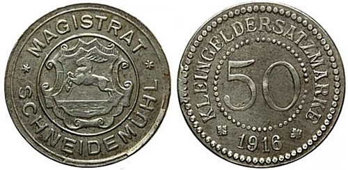 Odmiana; litera C w SCHNEIDEMUHL niesymetryczna i dotyka wewnętrznej obwódki