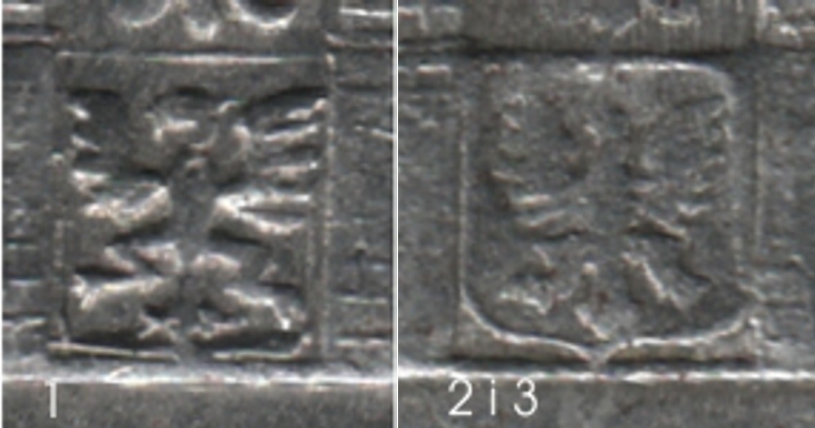 Odmiana; awers- 66 perełek zewnętrznych, rewers - 69 perełek zewnętrznych, 63 elementy sznurkowe wewnętrzne, wieże oddalone od otoku