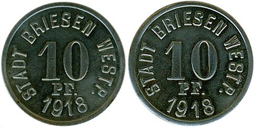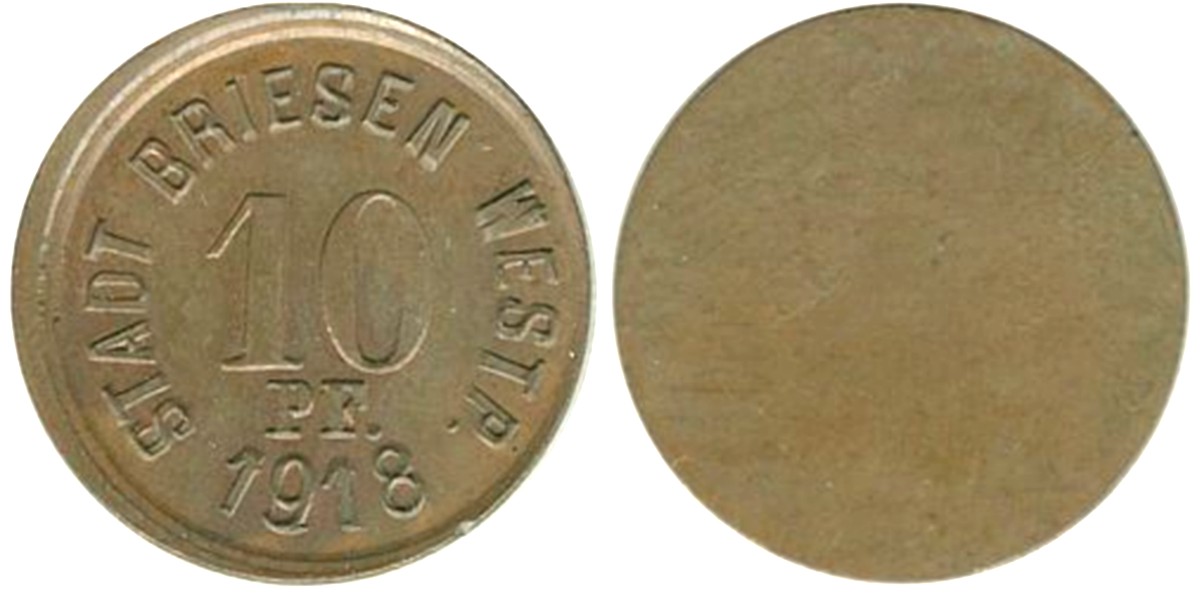 3. 10 fenigów 1918 ∅ 22,4, grubość 5,9mm (znane od 3,0 do 7,0mm)miedź, waga 19,05g jednostronny